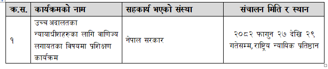 उच्च अदालतका न्यायाधीशहरुका लागि वाणिज्य लगायतका विषयमा प्रशिक्षण कार्यक्रम, २०८२ फागुन २७ देखि २९ गतेसम्म, राष्ट्रिय न्यायिक प्रतिष्ठान