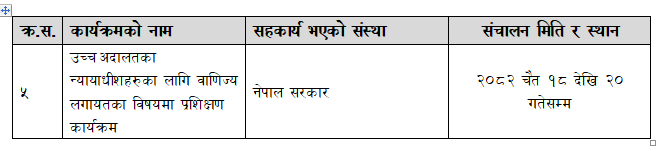 उच्च अदालतका न्यायाधीशहरुका लागि वाणिज्य लगायतका विषयमा प्रशिक्षण कार्यक्रम (२०८२ चैत १८ देखि २० गतेसम्म)