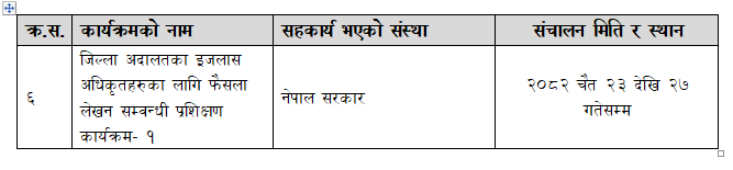 जिल्ला अदालतका इजलास अधिकृतहरुका लागि फैसला लेखन सम्वन्धी प्रशिक्षण कार्यक्रम- १(२०८२ चैत २३ देखि २७ गतेसम्म)