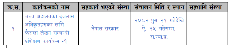 उच्च अदालतका इजलास अधिकृतहरुका लागि फैसला लेखन सम्वन्धी प्रशिक्षण कार्यक्रम -१ (२०८२ पुस २१ गतेदेखि ऐ. २५ गतेसम्म)