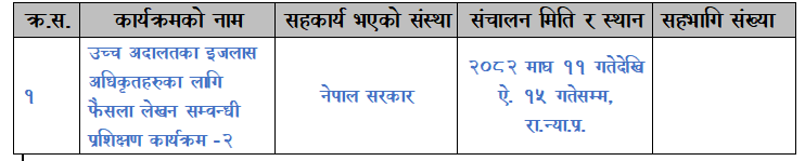 सर्वोच्च अदालतका इजलास अधिकृतहरुका लागि फैसला लेखन सम्वन्धी प्रशिक्षण कार्यक्रम -१ (२०८२ माघ ४ गतेदेखि ऐ. ९ गतेसम्म)